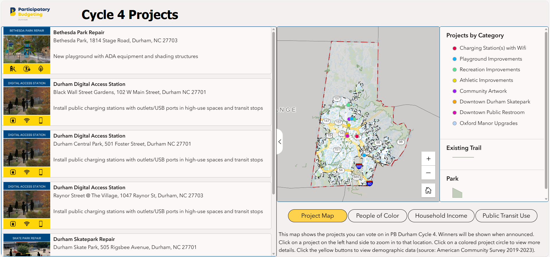 This cycle placed a strong emphasis on demographic alignment, working intentionally to ensure that the diversity of ideas collected mirrored the diversity of the Durham community. Utilize the dashboard below to take a peek at how participation looked in PB Cycle IV.